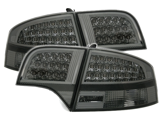 Smoke-sävyinen 4-osainen takavalosarja Audi A4 B7 -sedaneihin. Asennuksessa käytetään alkuperäisten valojen polttimopohjia, jotka siirretään uusiin valoihin. Mukana vastukset valovikailmoituksen estoon sekä keltaiset vilkkupolttimot. E-hyväksyntä (E-merkintä).